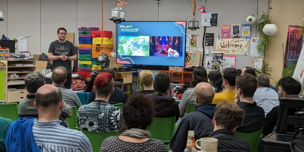 (Image - Me speaking at a Tech Exeter x Bristol Games Hub event in Feburary 2024. Image credit to Tech Exeter. If you like my t-shirt, it’s this one from Snipe & Wib’s merch store)
